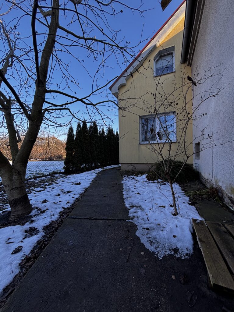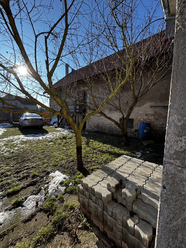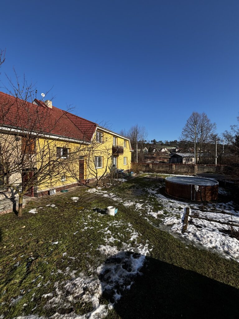 The house stands on a 1,151 m² lot and offers additional possibilities for use thanks to outbuildings, including a former barn. The location also provides peaceful living with good access to Prague, which is approximately a 30-minute drive away.